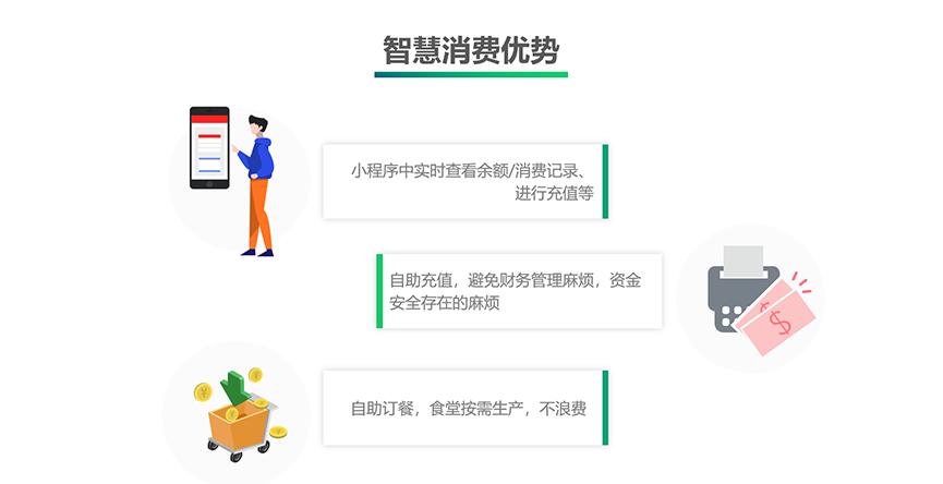 高效、精准快捷支付智慧消费场景应用方案,系统融合智能餐台自动结算、人脸消费、手机端订餐/充值等;提供了卡支付、手机二维码支付、和刷脸无感支付等多种支付方式,大幅提升了就餐者的支付体验;系统可扩展考勤、门禁、人行、视频等模块,实现统一管理。